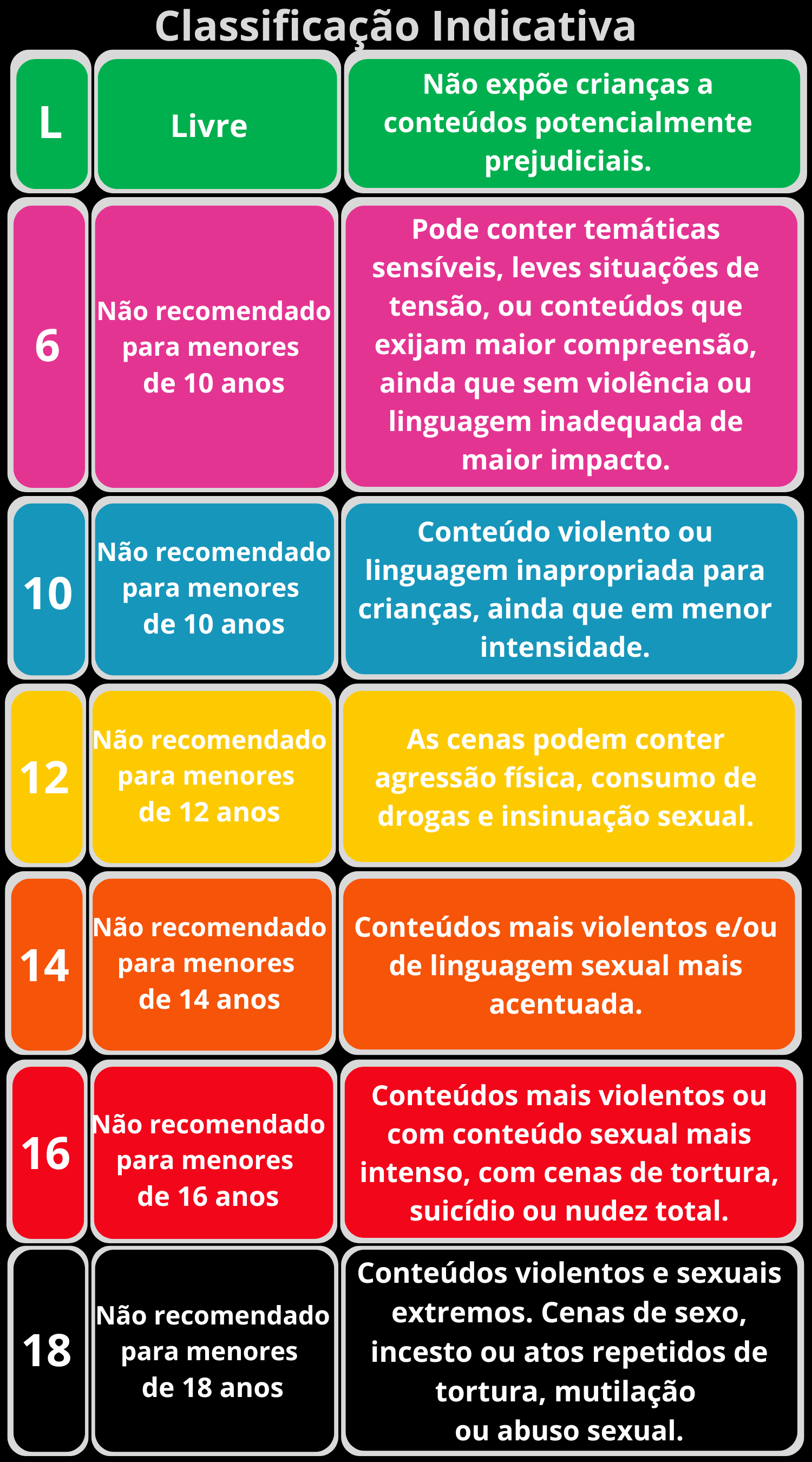 Segundo a Portaria nº 1.189, de 3 de agosto de 2018, do Ministério da Justiça, que regulamenta o processo de classificação indicativa de que tratam o art. 74 da Lei nº 8.069, de 13 de julho de 1990, o art. 3º da Lei nº 10.359, de 27 de dezembro de 2001, e o art. 11 da Lei nº 12.485, de 12 de setembro de 2011: